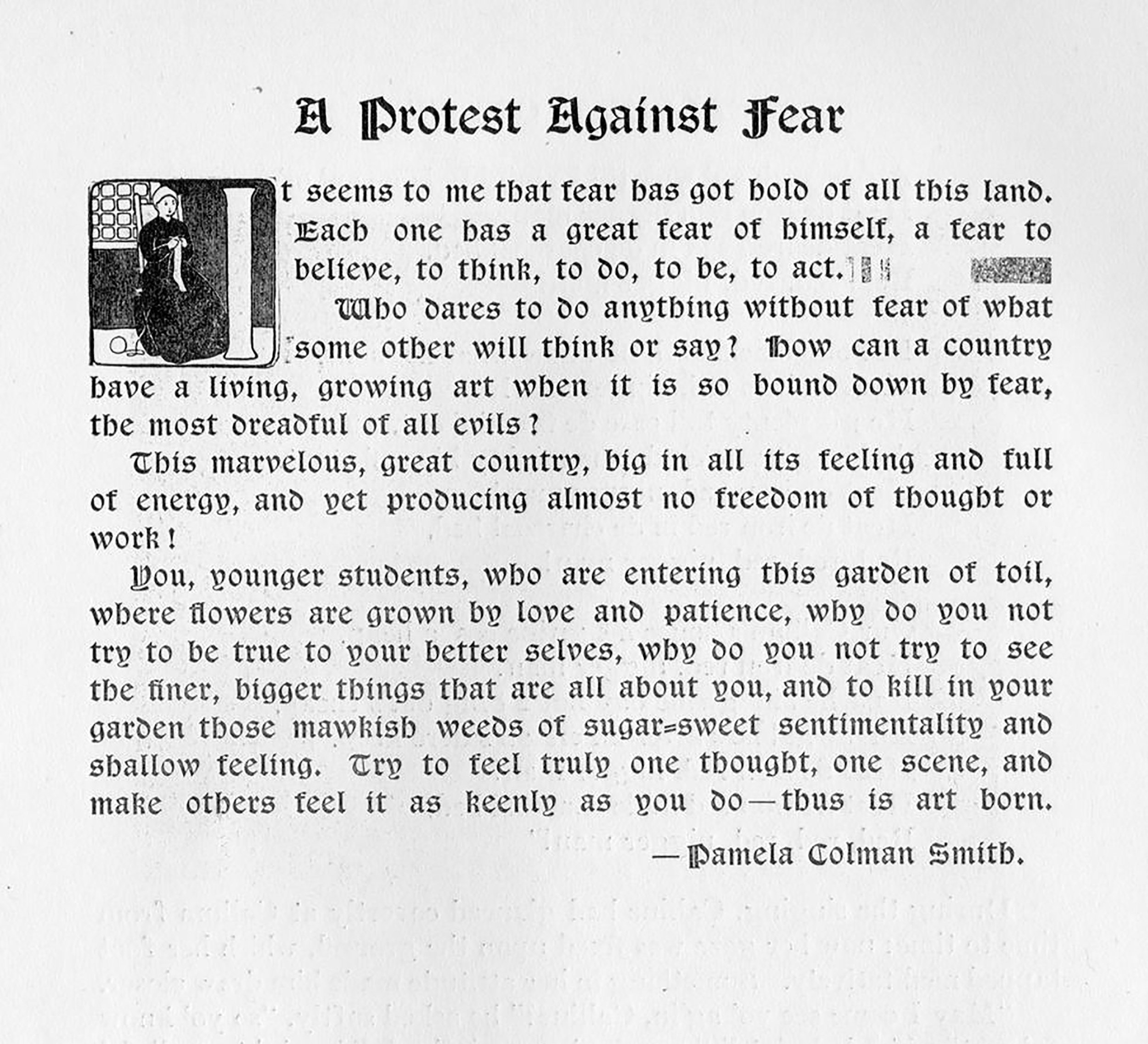 The Times quotes Colman Smith’s A Protest Against Fear. Pixie speaks through the newspaper, addressing 2026 as much as 1907: